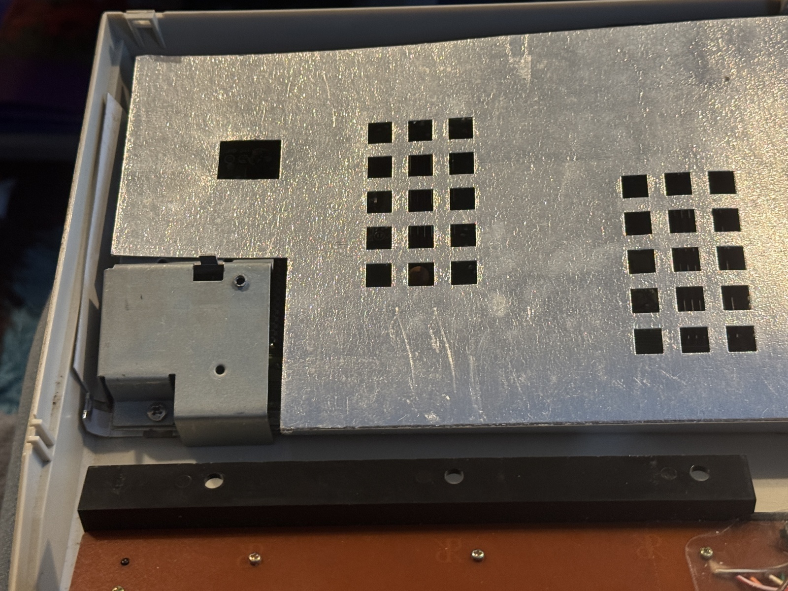 This is an ARM processor emulating a SID chip. It works perfectly, but there were a couple of tracks that I listened to on it that didn’t sound ‘quite right’. So, another Google search took me to Retroleum , and I bought a real SID chip. So now the whole board is completely original, although probably made up of multiple C64 parts. The only problems were that it was still using 3D-printed keyboard mounts, and it didn’t have the RF shield.